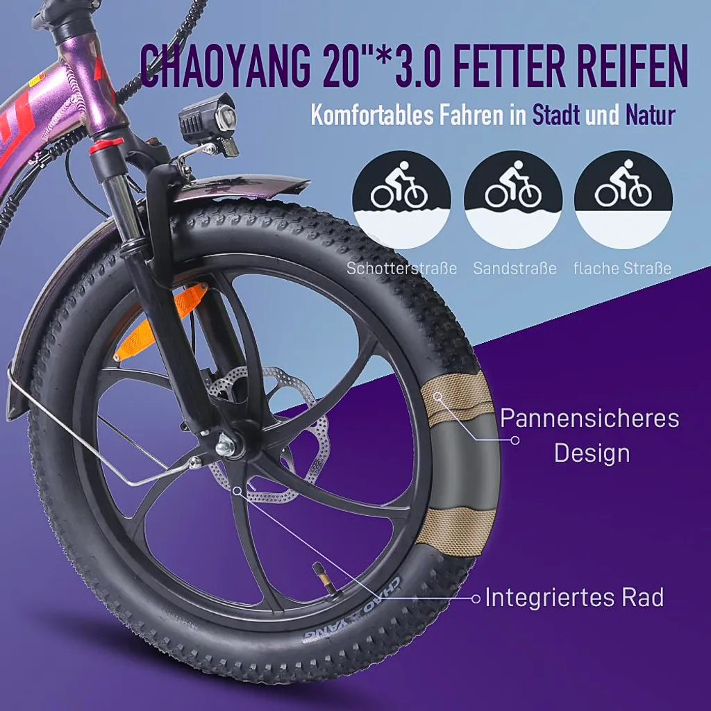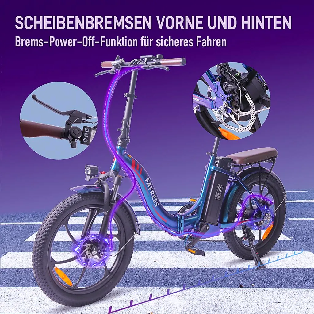 Erlebe eine super sanfte Fahrt dank doppelter Stoßdämpfung und pannensicheren 20×3.0 Zoll All-Terrain-Reifen. Für deine Sicherheit sorgen zuverlässige Doppelscheibenbremsen und StVZO-konforme Lichter – auch nachts bist du bestens ausgerüstet! 🛡️