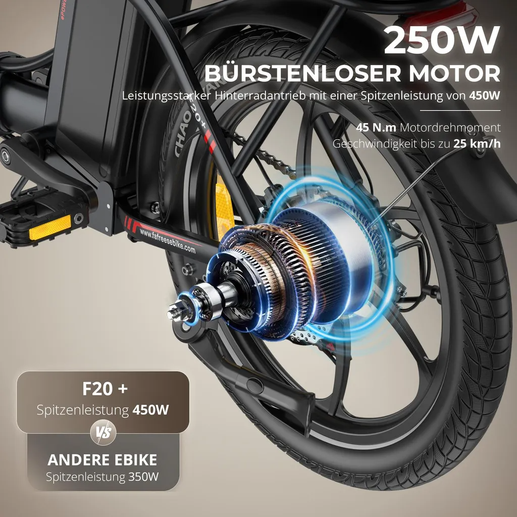 【Neues Upgrade】Das e bike F20+ ist mit einem bürstenlosen 250W Motor und einem aufgerüsteten 20Ah Li-Ionen-Akku in Automobilqualität ausgestattet, die eine hervorragende Leistung und eine Reichweite von 75–150 Kilometern pro Ladung bietet. Es gibt einen 6 km/h-Boost-Modus und eine Geschwindigkeitsregelungsfunktion. Das 7 Gang Getriebesystem bietet perfekte Kontrolle für unterschiedliche Fahrbedingungen.