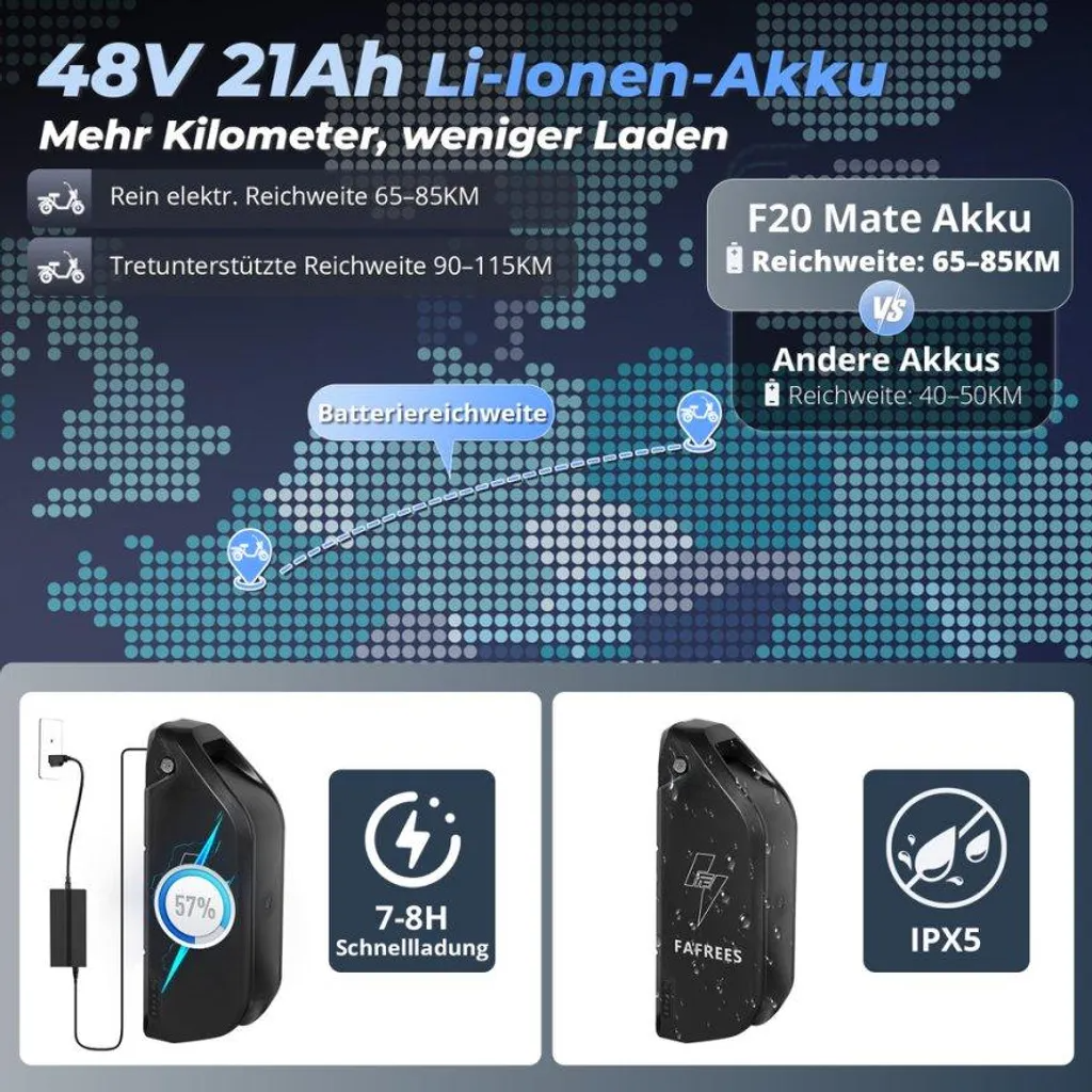 ️Langstrecken-Akku mit hoher Reichweite: Der Hochleistungsakku ist in zwei Varianten erhältlich – 48 V 21 Ah. Je nach gewähltem Fahrmodus ermöglicht er bis zu 115 km Pedalunterstützung pro Ladung. Das verbesserte Schnellladesystem verkürzt die Ladezeit auf nur 7–8 Stunden.