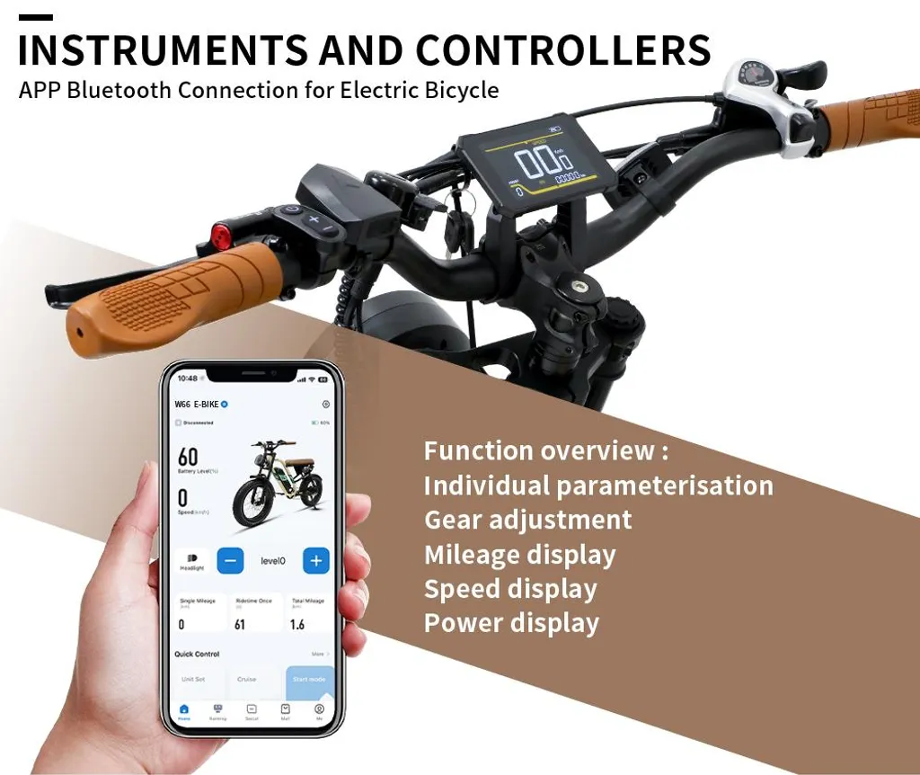Zusätzliche Features, die das W66 bietet, incluyen ein ​Bluetooth-fähiges Fahrerlebnis, was Ihnen ermöglicht, das Fahrrad mit einer dedizierten App zu verbinden. Sie können dadurch Details zu Geschwindigkeit, Batteriestatus und zurückgelegter Strecke erfassen.
